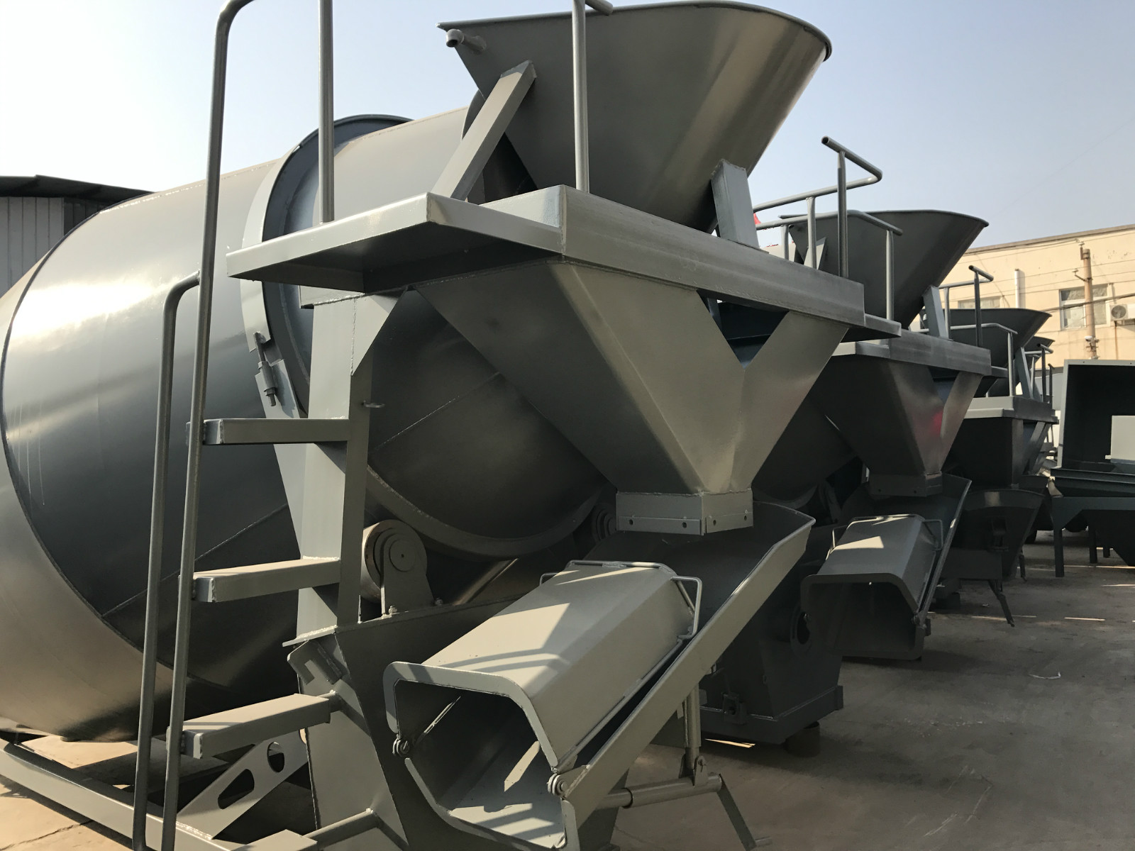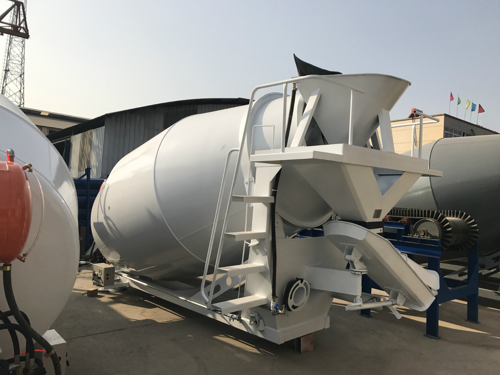 该混凝土搅拌机运输车搅拌筒和4.T自卸车底盘用2骑马螺栓及垫铁将其牢固连接在一起,组成混凝土运输车。主要作用是将搅拌好的混凝土迅速及时的运送到目的地,也可作为搅拌筒使用。